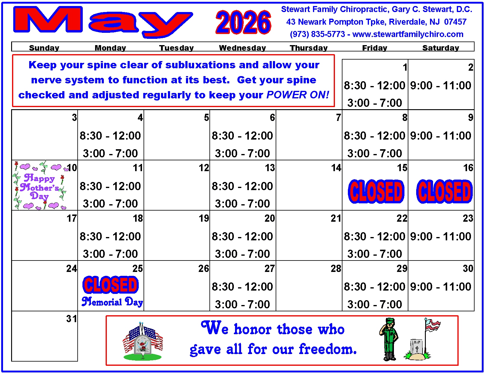 We rarely close on account of the weather, but occasionally if it is severe enough we do modify our hours. The best place to find current information is on our Facebook page. If we should need to close early or open late, we will post it on Facebook. You should not need a Facebook account in order to view our page. We will also send out a text message to our existing patients.